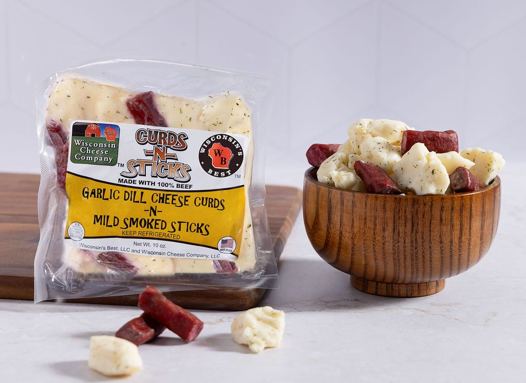 - Flavorful garlic dill cheese curds paired with smoky, savory beef sticks